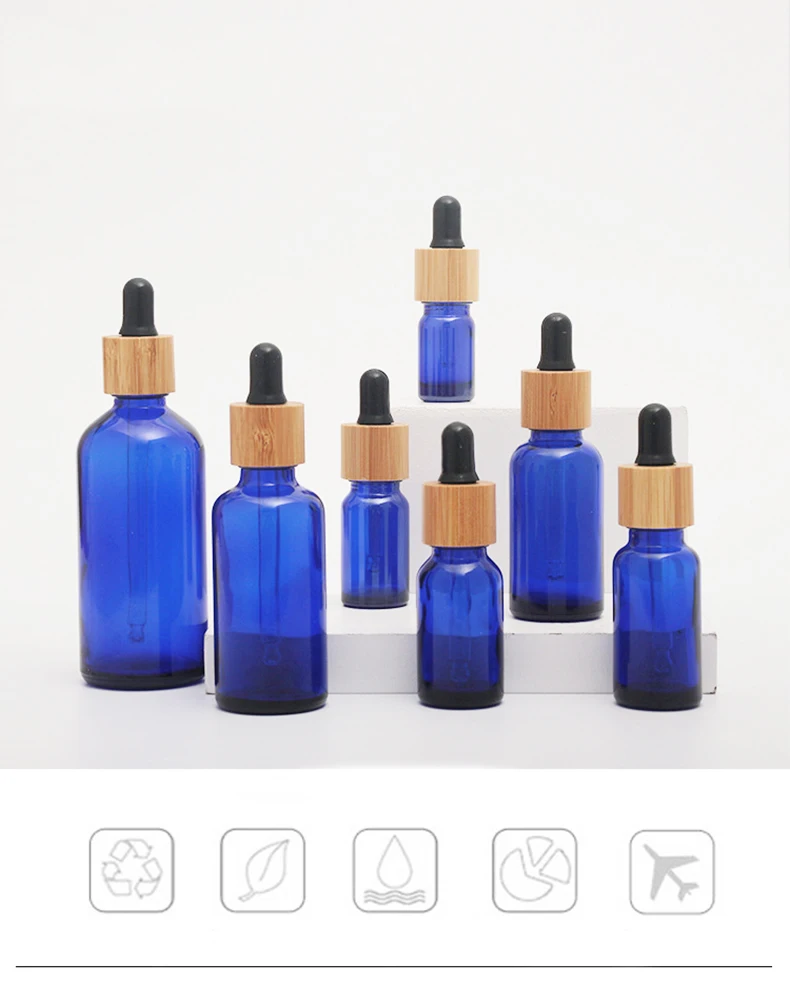10PCS/LOT Blue Glass Dropper Bottle Natural Bamboo Cap Refill For Essence Massage Face Oil Aromatherapy Liquid Skincare
